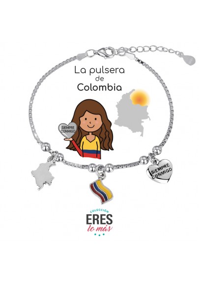 Pulsera De Paises Eres Lo Más Colombia hecha en plata, con delicados dijes que representan el amor por tu país: la silueta del país, su bandera y un corazón con el mensaje “Siempre conmigo”.