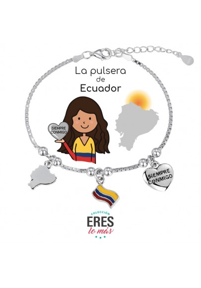Pulsera De Paises Eres Lo Más Ecuador hecha en plata, con delicados dijes que representan el amor por tu país: la silueta del país, su bandera y un corazón con el mensaje “Siempre conmigo”.