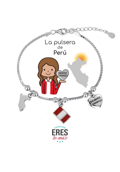 Pulsera De Paises Eres Lo Más Perú hecha en plata, con delicados dijes que representan el amor por tu país: la silueta del país, su bandera y un corazón con el mensaje “Siempre conmigo”.